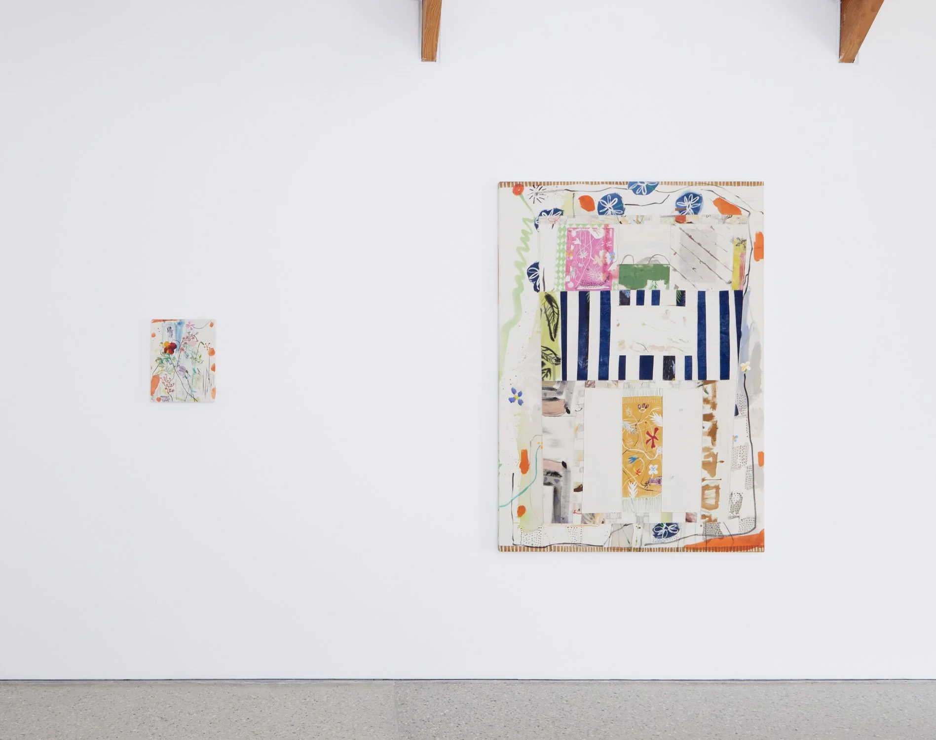 Ben Sanderson (b.1986) works in painting, drawing and textiles, often returning to existing pieces and transforming them: monotypes on paper are developed and echoed in printed elements that appear on canvas, canvas is mulched to become rag paper, which in turn becomes a ground for new painting.